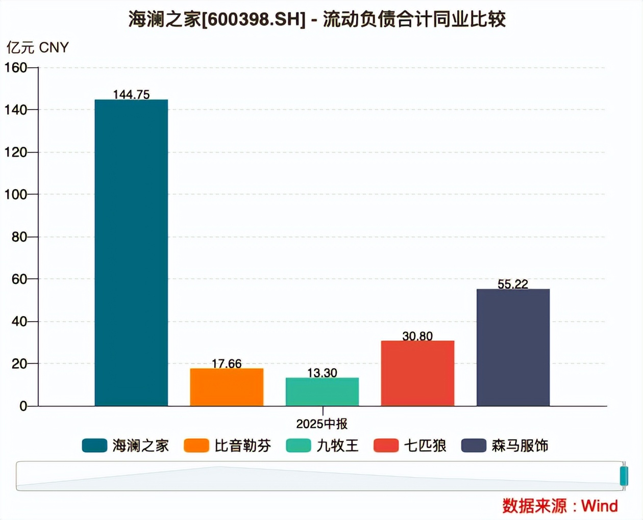 2025上半年,海澜之家流动负债高达144.75亿元,是九牧王、比音勒芬、七匹狼等男装品牌的好几倍。