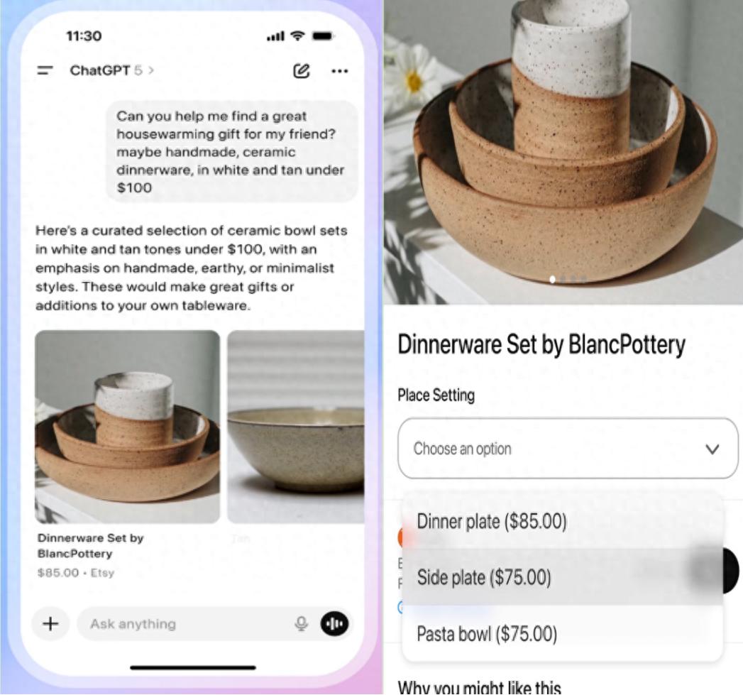 Open AI(ChatGPT的母公司)演示了整个购物过程。用户向ChatGPT提出购物需求:“朋友乔迁,帮忙选一份礼物。手工制作的、陶瓷材质的餐具就不错,最好是白棕配色,预算在100 美元以内。 ”ChatGPT经过一番搜索、筛选、匹配之后,给用户推荐了一件陶瓷餐具套装,该产品来自于手工艺品电商平台Etsy。