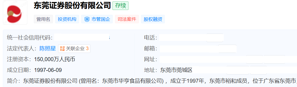 天眼查信息显示,东莞证券成立于1997年6月9日,注册资本15亿元,法定代表人是陈照星,他亦是东莞证券的董事长。