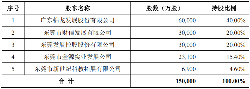 2014年10月改制为股份公司之后,东莞证券的股权结构变更为广东锦龙发展股份有限公司(以下简称“锦龙股份”)持股40%、东莞市财信发展有限公司持股20%、东莞发展控股股份有限公司持股20%、金源实业持股15.40%、东莞市新世纪科教拓展有限公司持股4.60%。