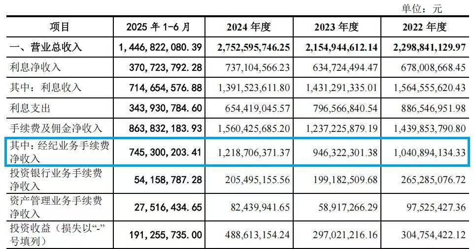 从业务结构来看,经纪业务手续费净收入始终是东莞证券主要的收入来源,2022年至2024年分别为10.41亿元、9.46亿元、12.19亿元,占营收比例分别为45.28%、43.90%、44.28%;2025上半年这一数据为7.45亿元,占营收比例为51.49%,这意味着东莞证券有一半以上的营收需要经纪业务来贡献。