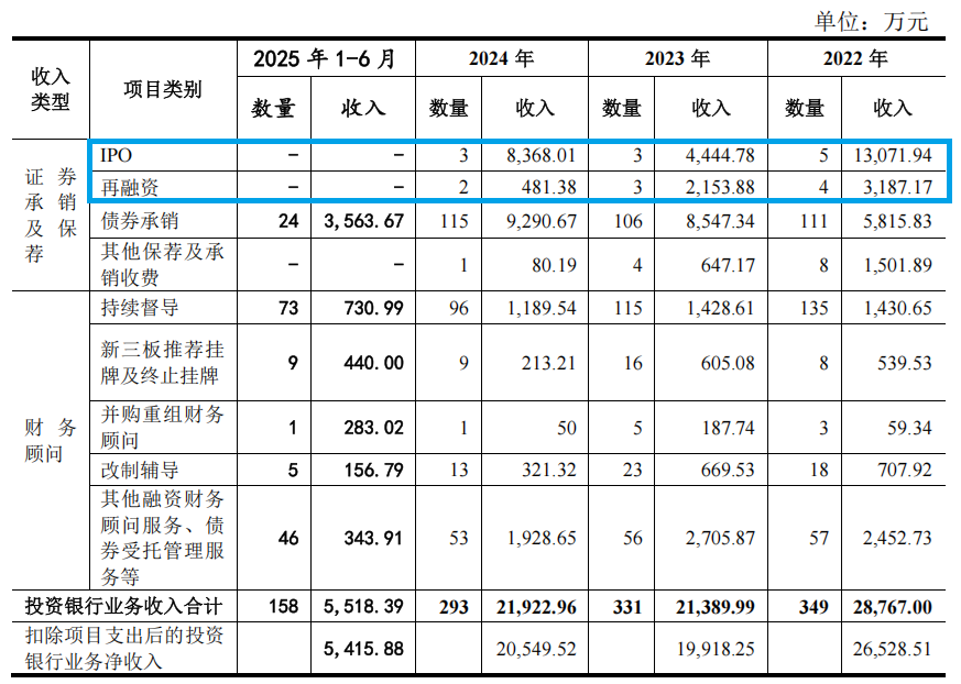 2025年上半年,东莞证券的投行业务净收入仅为0.54亿元,其中IPO、再融资保荐承销收入均为0元,而2022年至2024年的投行业务净收入分别为2.65亿元、1.99亿元、2.05亿元。