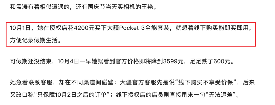 除了价格背刺,线上线下两个不同渠道购买大疆 Pocket3 体验“冰火两重天”,更是点燃了一些用户的不满情绪。
