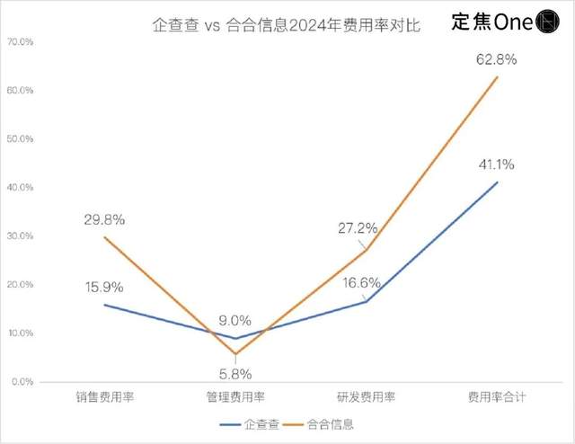 反观合合信息,则在“求增长”:2024年,销售费用率是29.8%,研发费用率是27.2%,费用率合计高达62.8%。