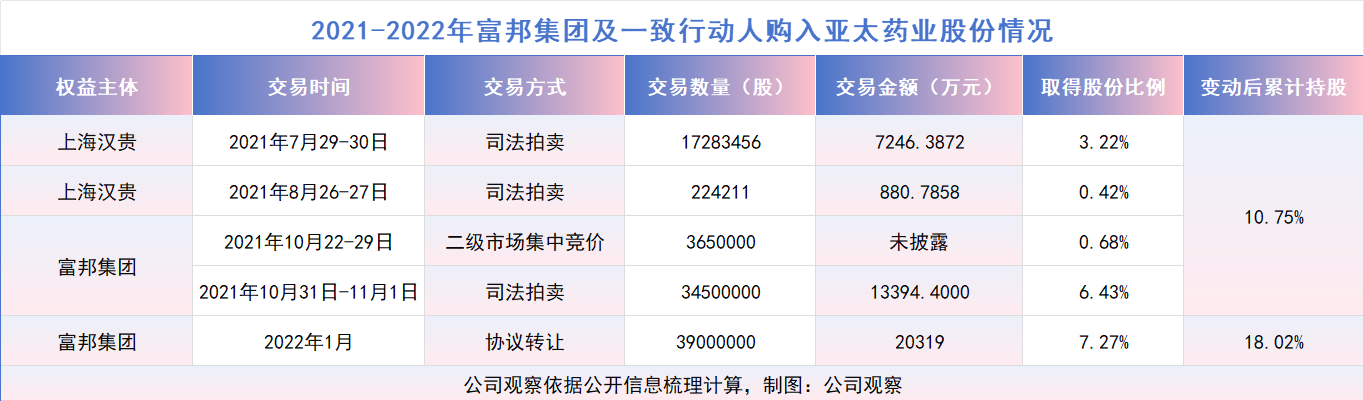 笔者梳理发现,富邦集团与汉贵投资当时通过司法拍卖、二级市场集中竞价的方式合计获得亚太药业股份5565.77万股,占总股本的10.75%;其中,通过司法拍卖所得股份为5200.77万股,对应2.15亿元的拍卖总价,以此得出这部分成本价为4.14元/股。