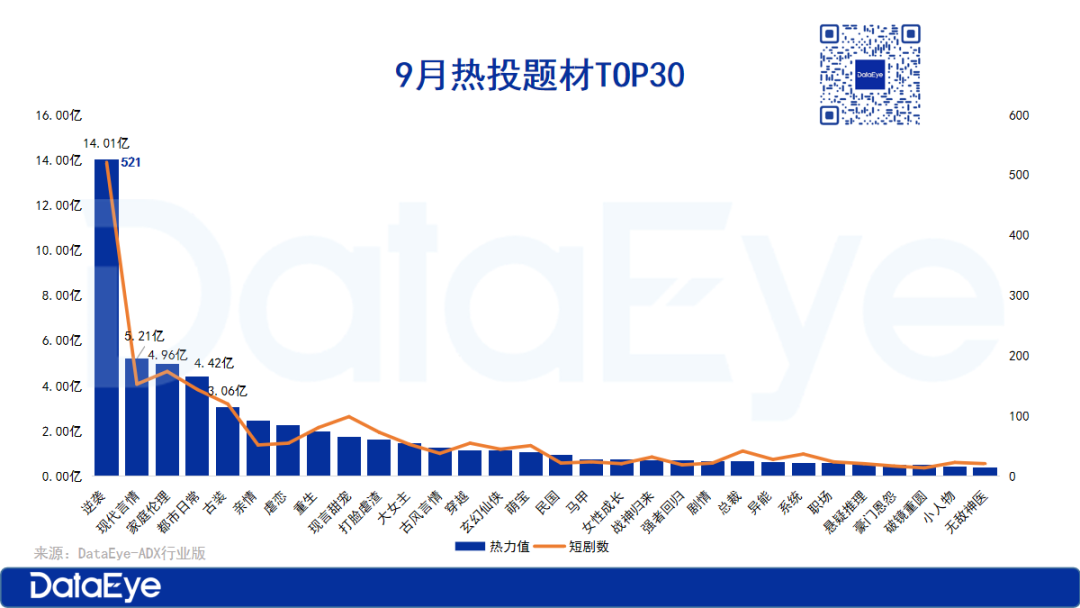 题材方面,本月有16种题材累计热力值超1亿,其中“逆袭”依旧是最火热的题材关键词,共关联了521部微短剧,热力值总值达14.01亿,在短剧数量和热力值上都较上期有所提升,短剧数增加了10部,热力值增加了2亿。