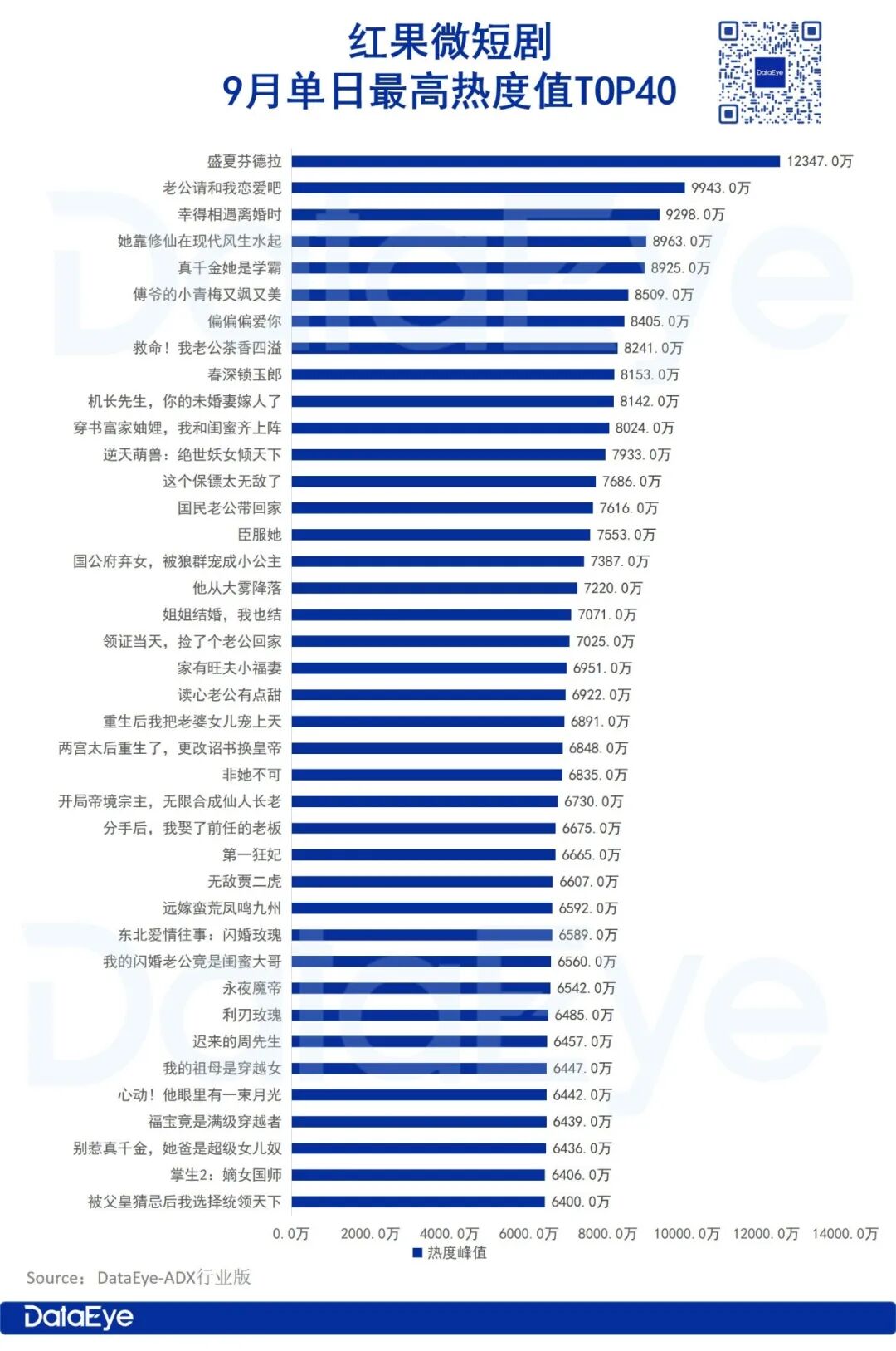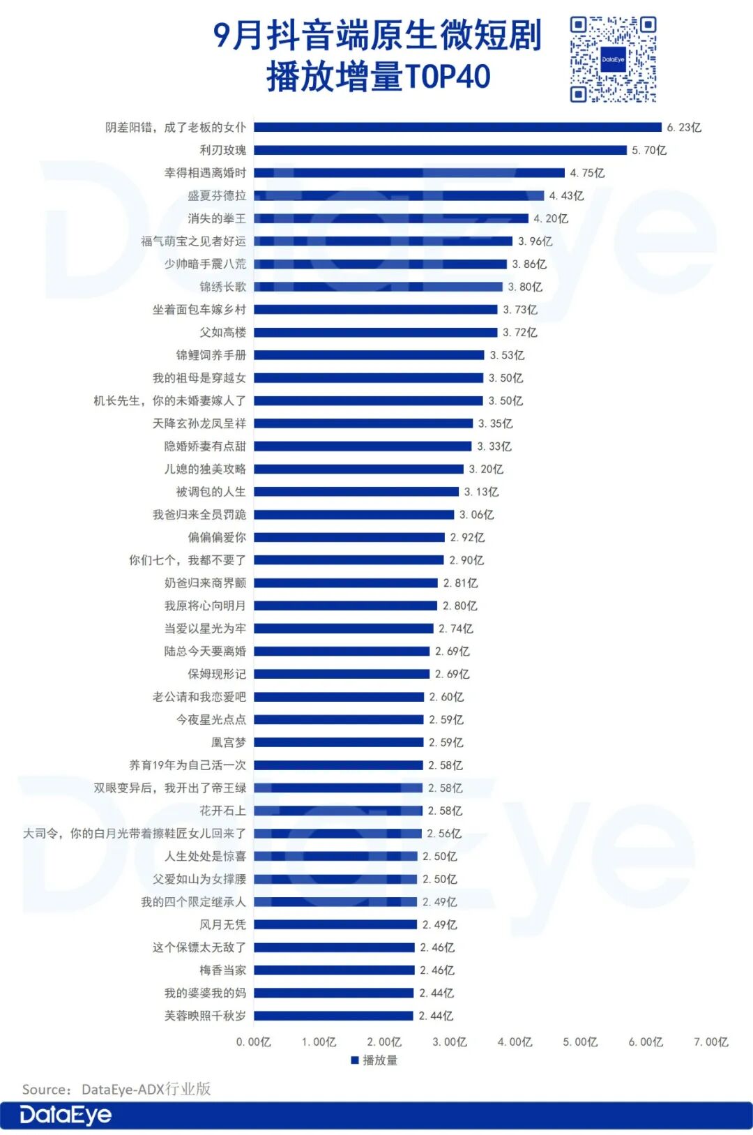 9月抖音端原生百强热播剧中,新剧占64部,较上期增加了19部。此外,有28部新剧闯入TOP40。TOP40的微短剧,播放增量共计128.39亿,40部微短剧播放增量均超2.4亿。