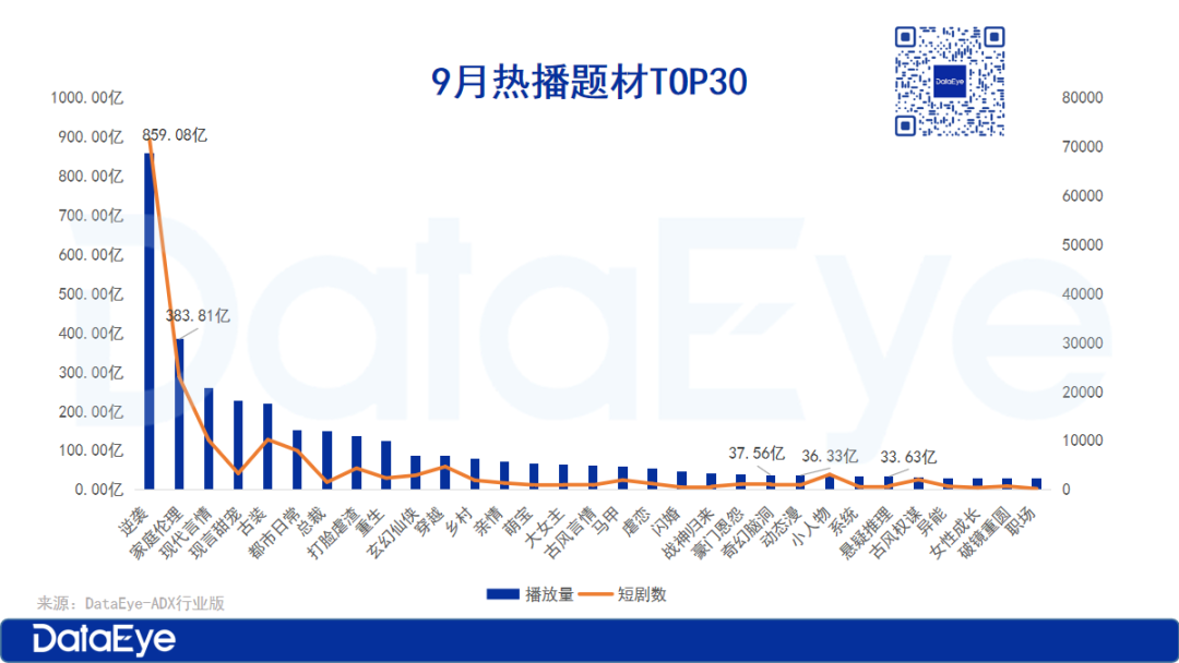 从题材上看,逆袭、家庭伦理、现言甜宠、都市日常、古装五大题材类型占据TOP5,其中“逆袭”题材遥遥领先。