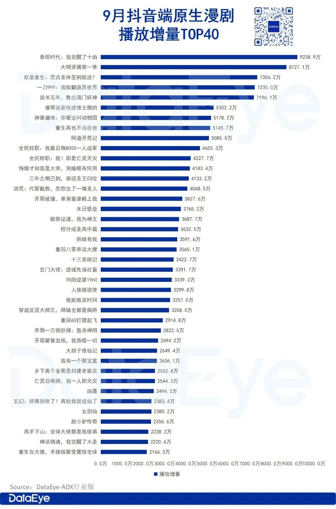 9月抖音端原生百强漫剧中,新剧占39部,有15部新剧闯入TOP40。值得关注的是,漫剧端原生本月累计播放增量达36.34亿,占本月抖音端原生播放增量大盘的2.14%。