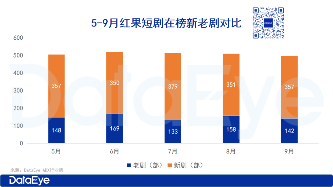 9月,登上过DataEye红果日榜的微短剧数量共499部,其中9月新上线的微短剧占357部,新剧占比达71.54%。在总数方面,变化不大,但在新剧方面较8月,新剧数量有所增加。