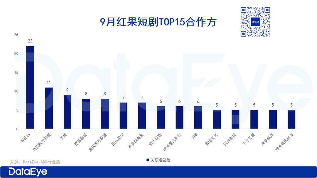从合作方角度来看,9月红果短剧生态呈现头部集中化与策略差异化的双重格局。9月在榜短剧数最多的是听花岛,共有22部微短剧在榜;其次是西安秋元影视,共11部微短剧在榜;第三是西安秋元影视共9部短剧。