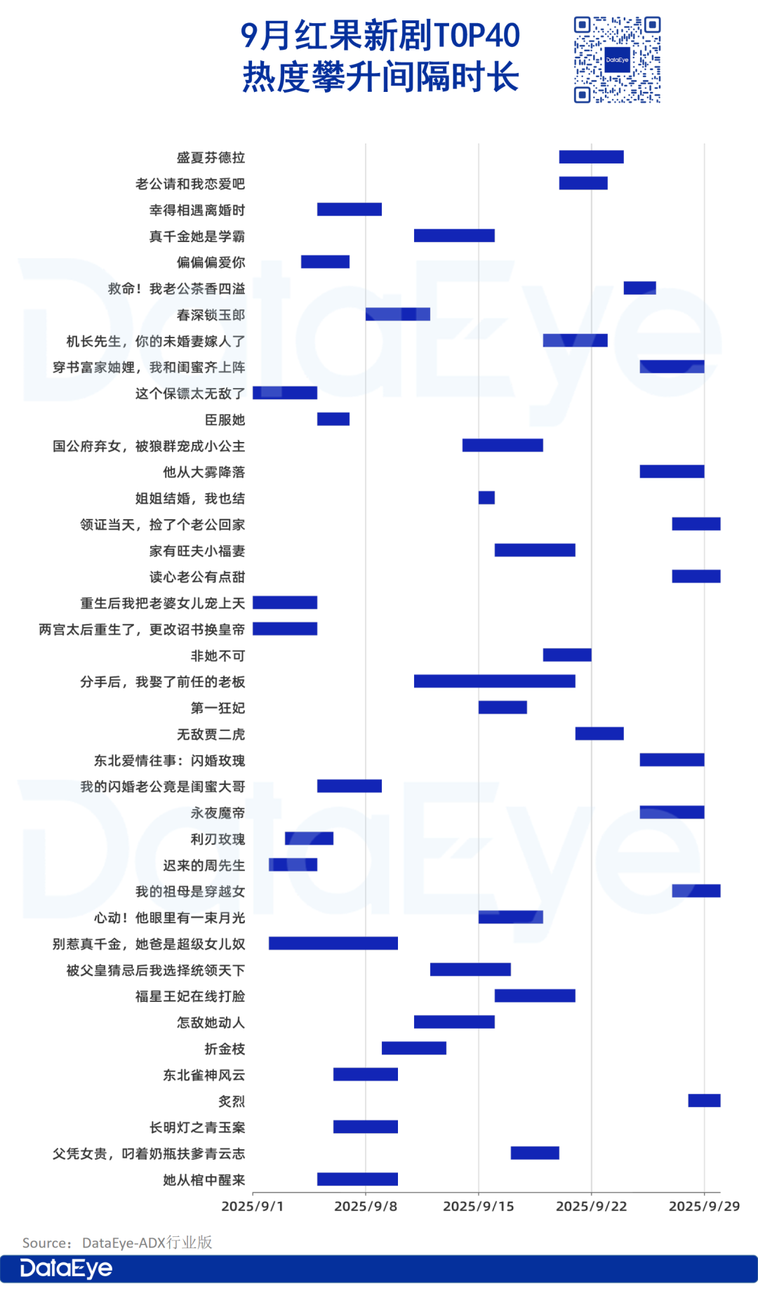除此之外,9月14日上线的《烬上月光》和9月18日《儿媳的独美攻略》虽然热度表现不够突出,但也是一经上线就“空降”了日榜,最高热度分别为5902W和5602W,本期并未闯入TOP40。