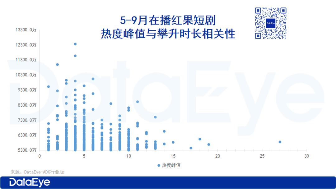 总体来看,攀升时长决定“爆款率”。从热度峰值与热度攀升的时长关系来看,部分超爆款短剧能够在5天内完成热度攀升。上榜热剧普遍能在10天内完成热度攀升,超出10天仍未突破7000万热度的微短剧可能面临淘汰风险!