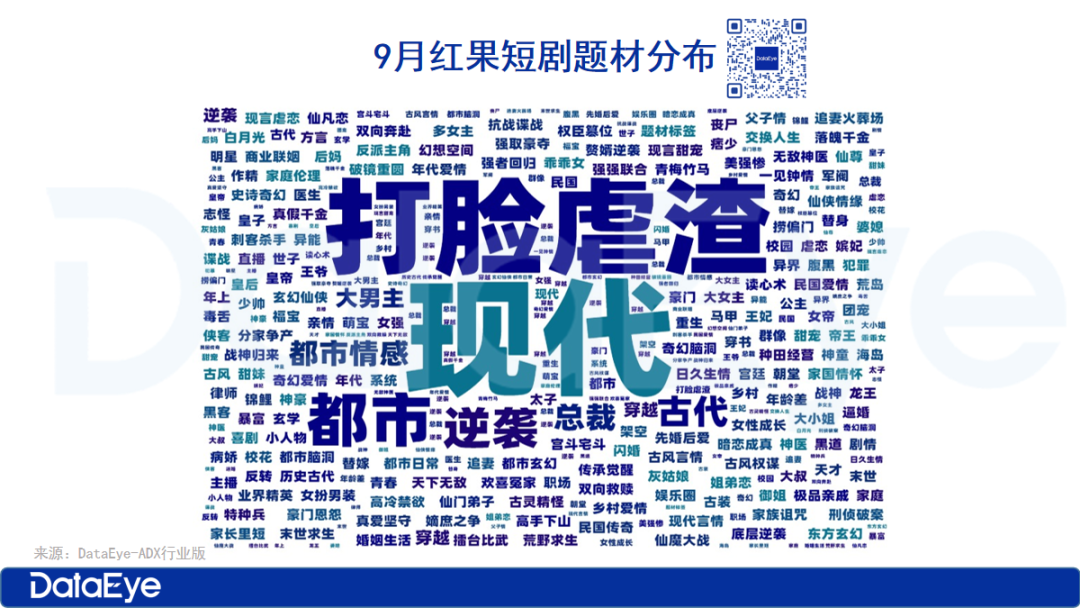 分析9月红果短剧的题材相关数据可以发现,9月前五名的题材均为:现代(265次)、打脸虐渣(229次)、都市(178次)、逆袭(158次)、古代(140次)。