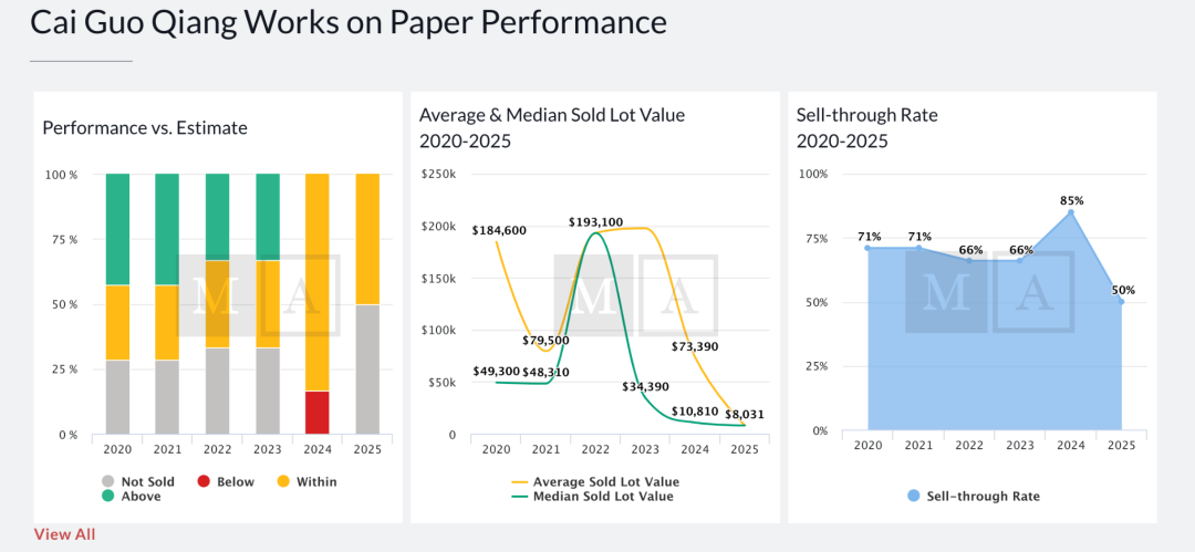 之前被泡沫抬高的价格体系,在资本的釜底抽薪之下,开始了痛苦但必然的“挤水分”过程。蔡国强纸上作品的拍卖数据,不过是这场宏观经济变局下,一个具体而微的缩影。