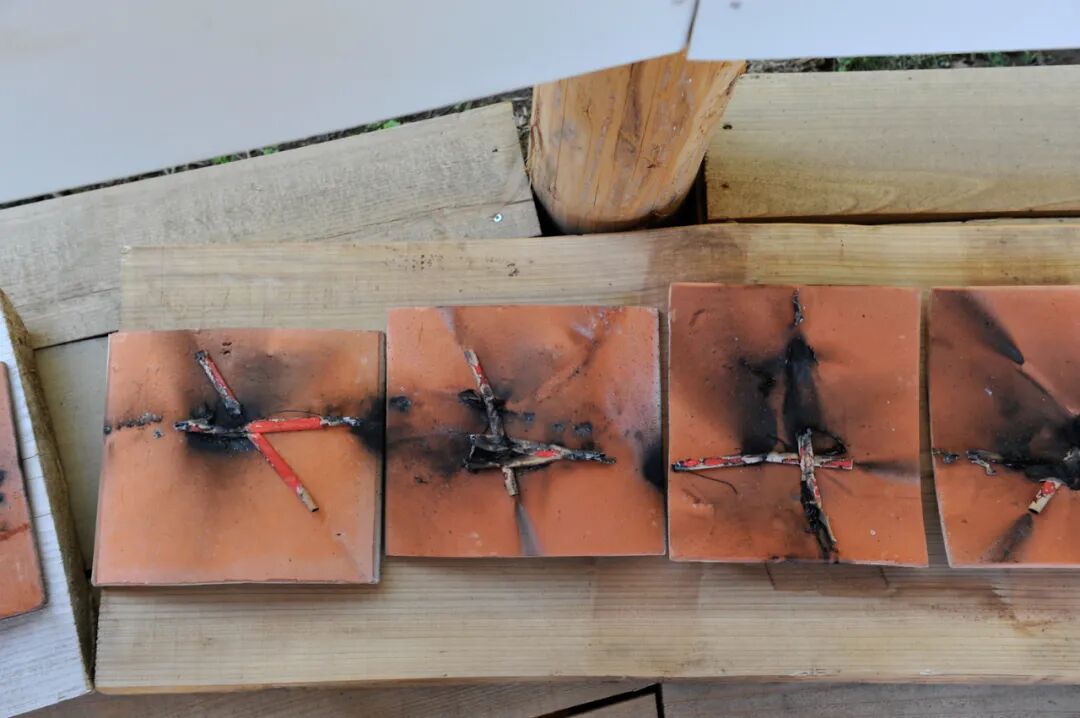 作品点燃之前,见近景:屋顶上被贴上雷管和火药的陶色瓦片。
