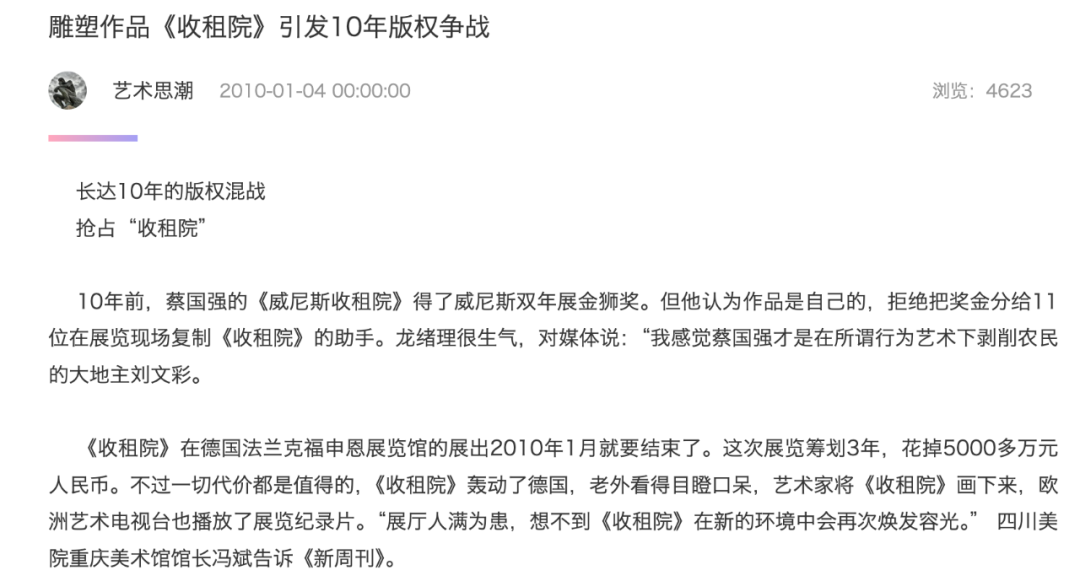 让批评者愤怒的是,蔡国强居然拒绝分奖金给11位现场复制《收租院》的助手。