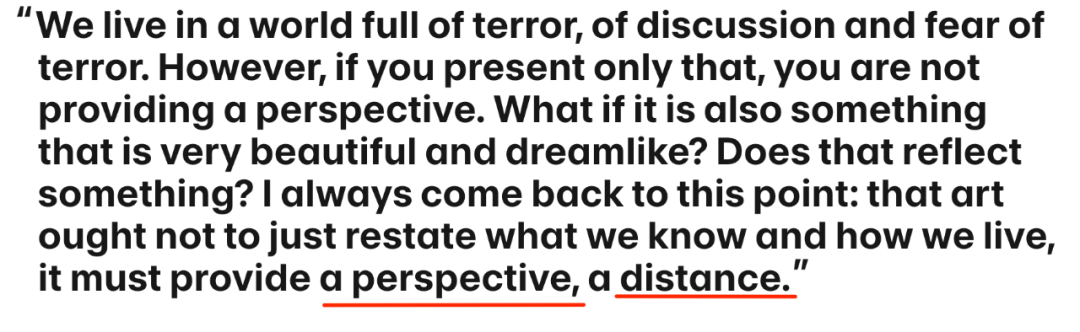 在某次采访中,蔡国强提到了他理解的艺术家的职责:提供一个视角,一种距离,而不是重复已知,展示那些生活中的恐惧。