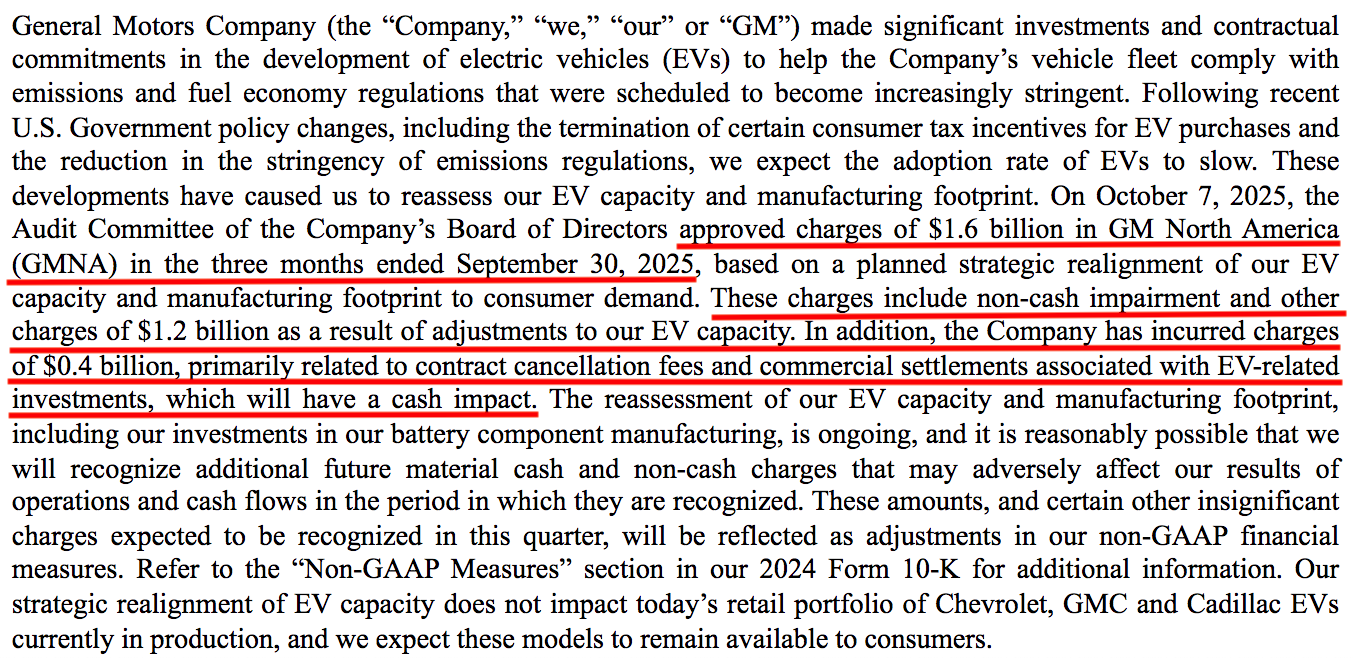 也就是说,政策风向变了,会对公司未来经营产生比较大的影响,按披露规定应该发公告。由于同一时间段工厂产能是一定的,是排产给燃油车,还是新能源车,提前都有周密布局,突然间形势变化扰乱了计划,短期内定会带来损失或减值,取消相关合同又额外会涉及违约金之类,因此要单独计提这个影响。通用汽车会在即将发布的Q3财报中non-GAAP部分——即非通用会计准则下对这笔计提的调整进行说明。