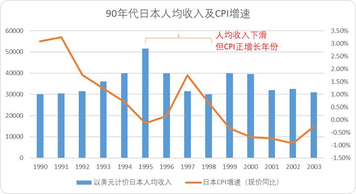 图:90年代日本人均收入(以美元计)及CPI增速,来源:Choice金融客户端