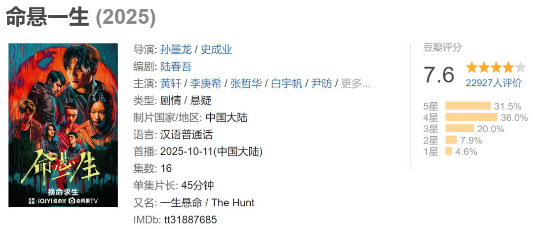 单以豆瓣评分而言,该剧7.6的分数并不算太强,在角色复杂度、节奏舒适度、细节丰富度等层面,也与《隐秘的角落》《沉默的真相》等昔日神作相去甚远。但在今年华语悬疑剧里已足够排名前三,也是近期值得一看的佳作。