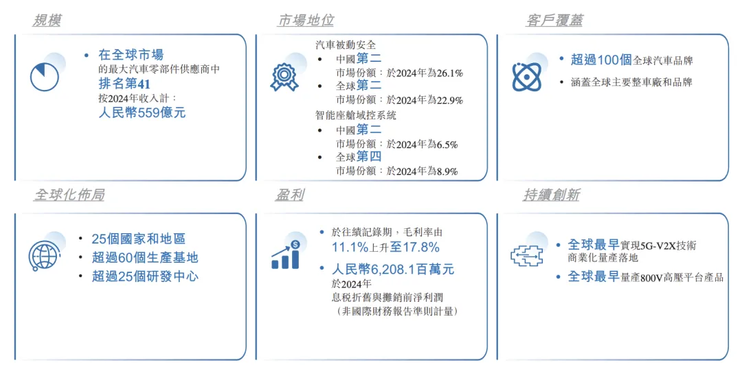 招股书显示,按收入计算,均胜电子是中国第二大、全球第二大汽车被动安全产品提供商。2024年,公司在全球汽车零部件行业排名第41位。
