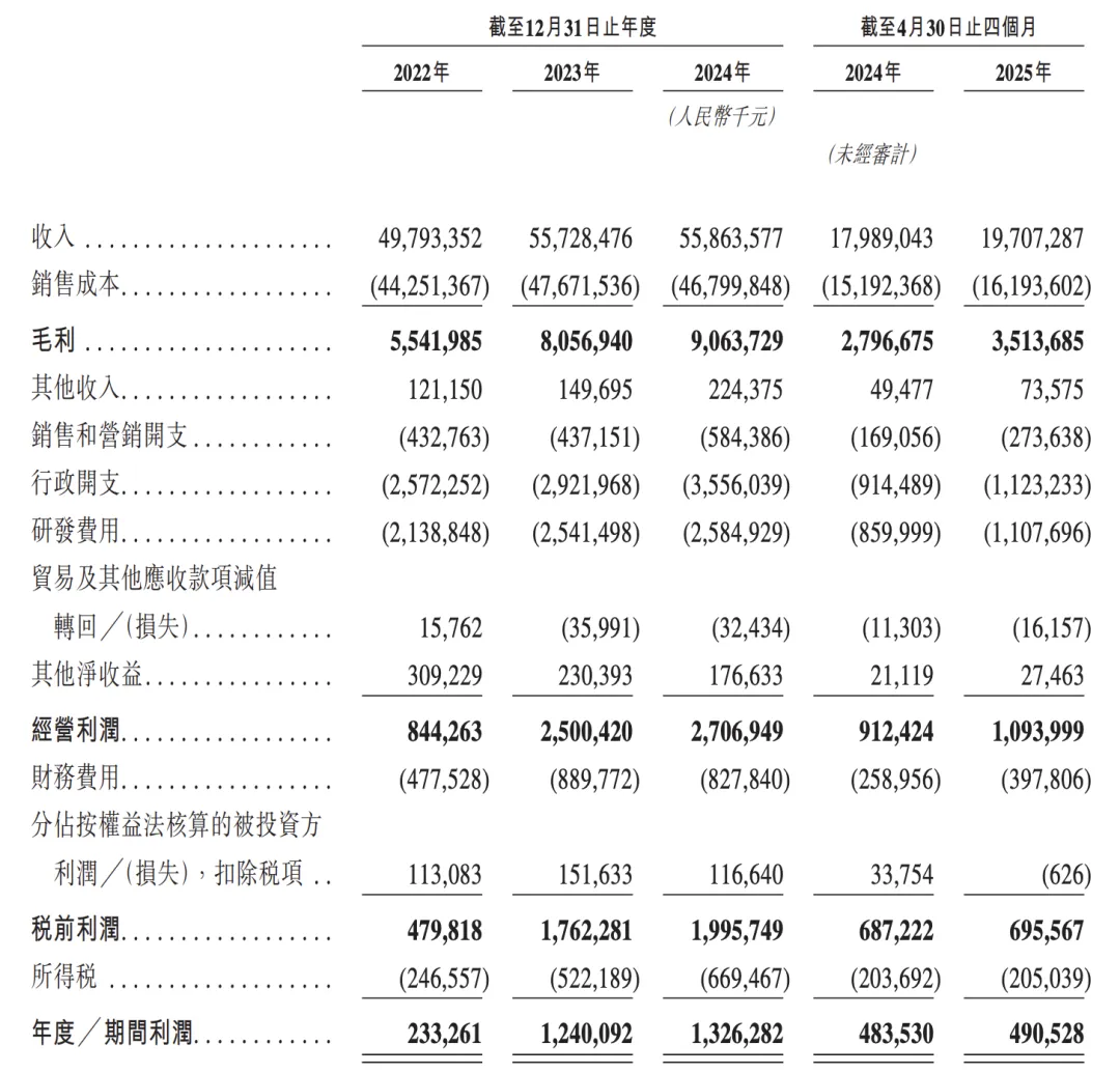 招股书显示,2022年、2023年、2024年和2025前四个月,营业收入分别为497.93亿元、557.28亿元、558.64亿元和197.07亿元,同比增速为9.03%、11.92%、0.24%和9.55。