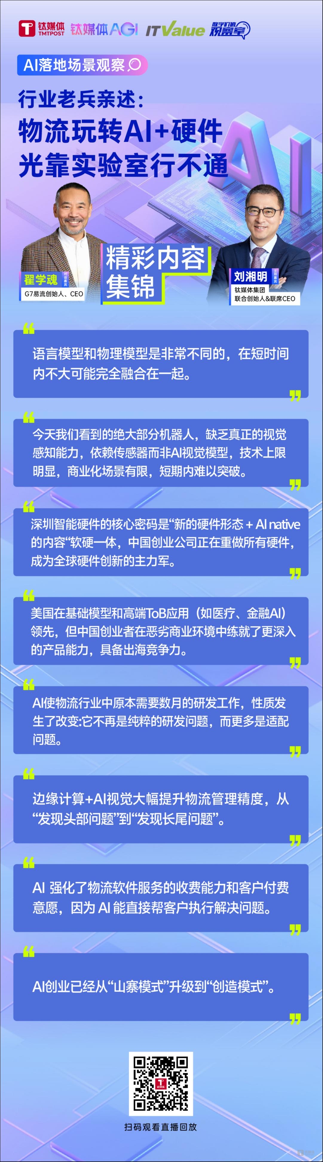 在钛媒体2025 数字价值观察室之AI落地指南系列直播中,钛媒体集团联合创始人刘湘明与深耕物流领域近30年的G7易流创始人翟学魂,围绕对机器人产业、中美AI差异及物流行业AI应用的深度观察展开了讨论。