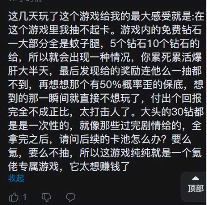 目前社区很多玩家表示,这款二游定价似乎有点贵。不光是单抽价格,福利也少得可怜。