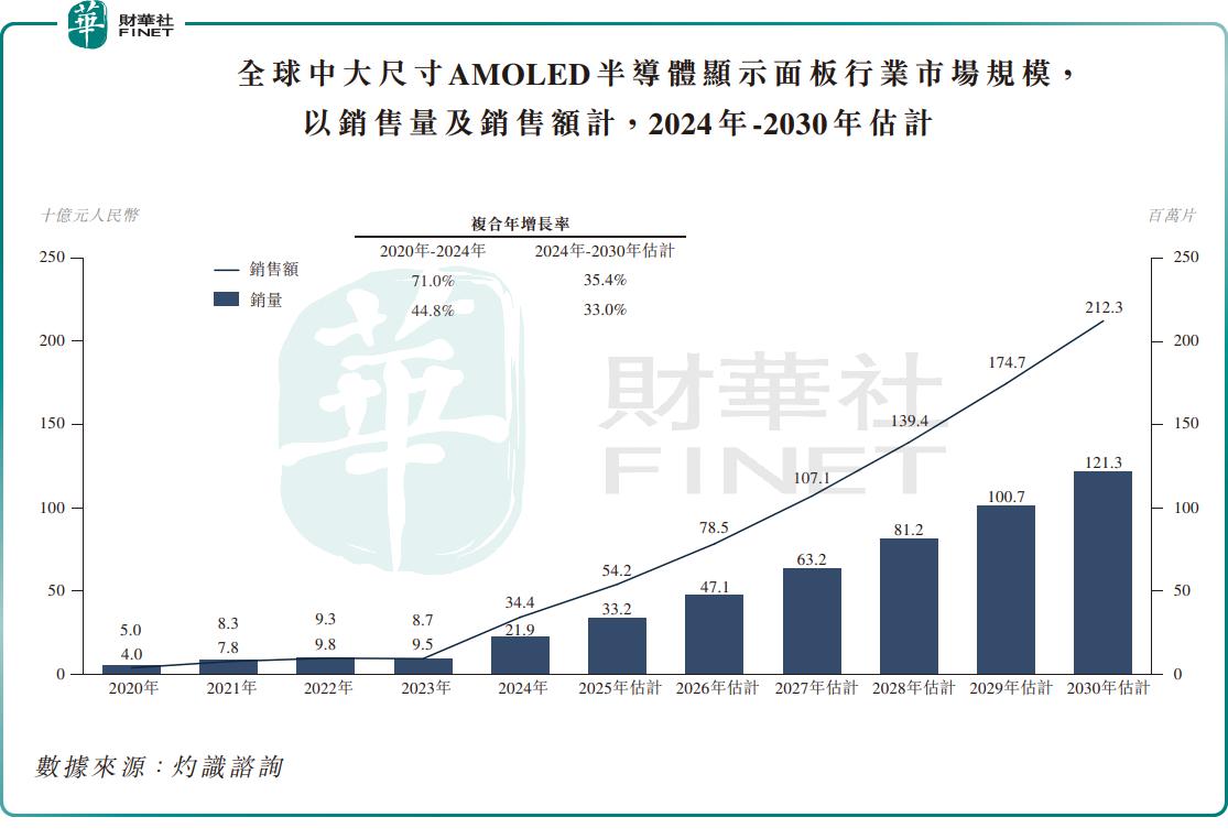 根据灼识咨询数据,全球中大尺寸AMOLED半导体显示面板市场规模在2024年约为279亿元,预计到2030年将超过1538亿元,复合年增长率高达32.9%。