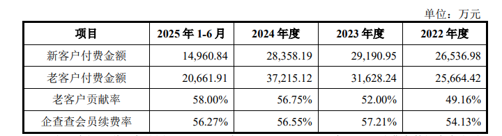 根据招股书,2024年,企查查新增付费用户数为50.76万个,较2023年减少4.8万个;2025年上半年新增付费用户数万25.11万个,略低于2024年的50%。从金额方面来看,2024年,新客户付费金额2.84亿元,较2023年下滑2.74%。