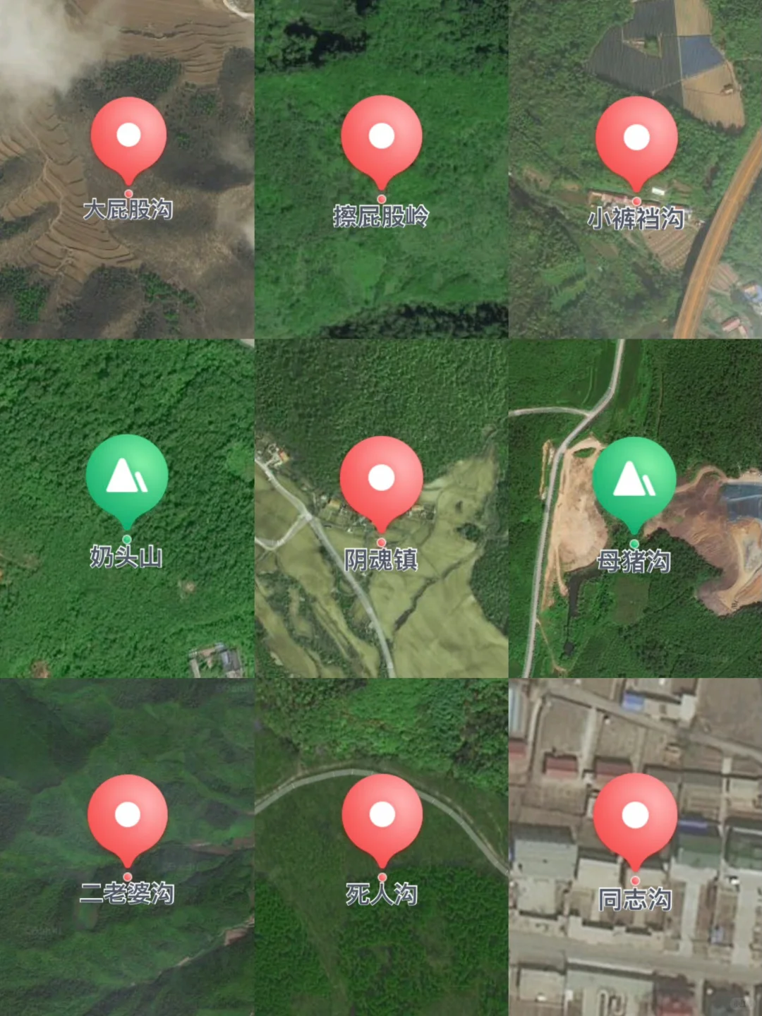 这里还有:擦屁股岭、阴魂镇、大母猪沟,奶头山(我都怕被和谐)、王八脖子遗址、老秃顶子山、干饭盆……
