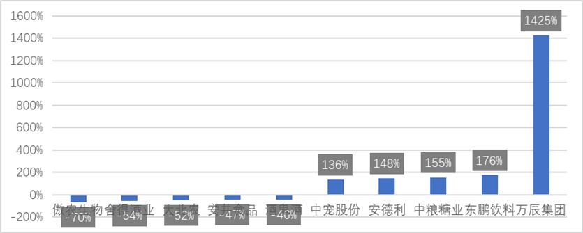 图:食品饮料行业近3年涨跌幅前五名;来源:企业财报,锦缎研究院