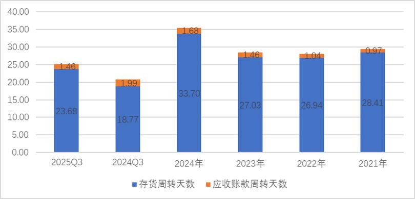 从营运周期来看,东鹏24年及25年前三季度均有所增长,但相比同业尚处于合理水平。24年存货周转天数33.7天,应收账款周转天数1.68天,合计35.38天,与康师傅基本相当,优于农夫山泉85.87天。25年前三季度营运周期25.14天,同比上升4.37天。