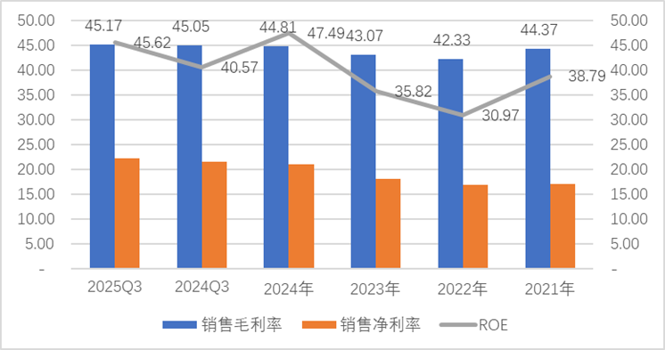 上市以来其销售毛利率稳定在44%左右,销售净利率稳中有升,24年为21%,或与规模效应分摊费用有关。21年至24年ROE介于38.79%-47.49%。![]()