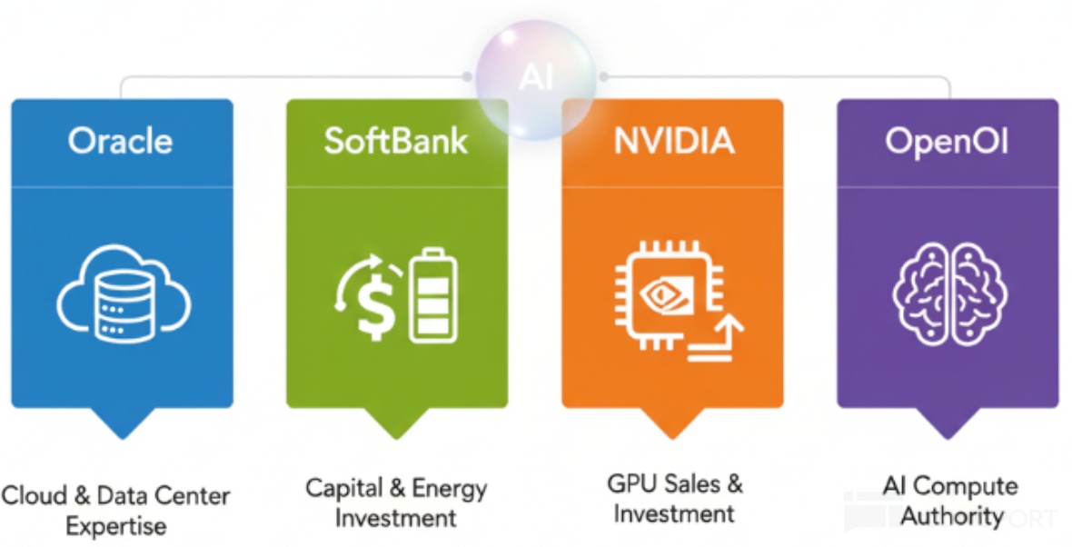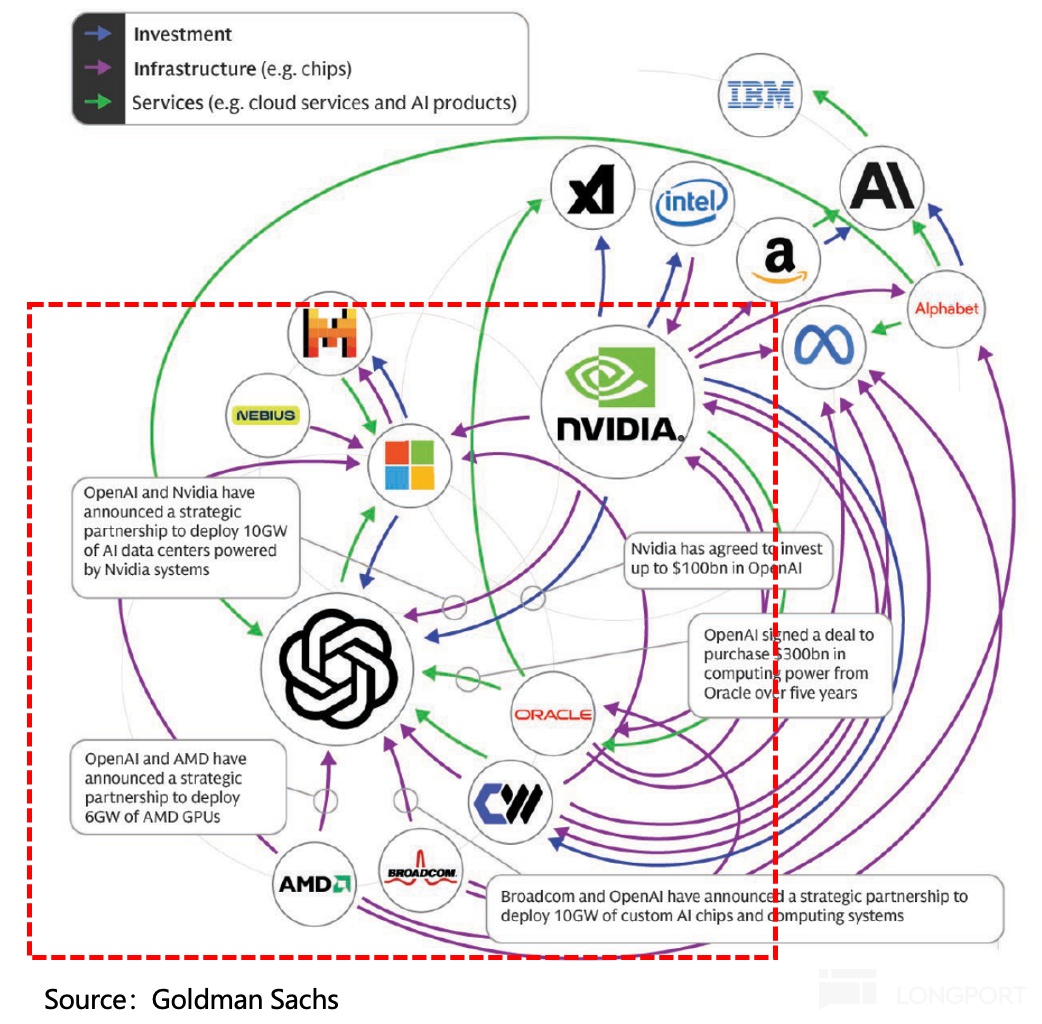 最复杂的合作生态,就是 OpenAI 的星际之门项目,它将 OpenAI 与$甲骨文(ORCL.US) 、$英伟达(NVDA.US) 、$软银(9984.JP) 等公司做了深度关联,被市场诟病的 “资金循环”、“算力重复叠加” 就在于此。