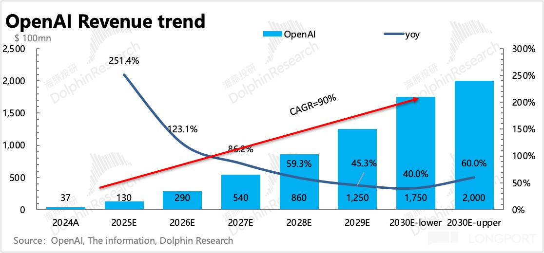 面对承付能力质疑,OpenAI 的商业化展望是这样的:2025 年预计营收 130 亿(隐含下半年收入 87 亿,环比 100% 增长),2029 年目标 1250 亿,2030 年目标 1740-2000 亿,未来 5 年 CAGR 超过 90%。