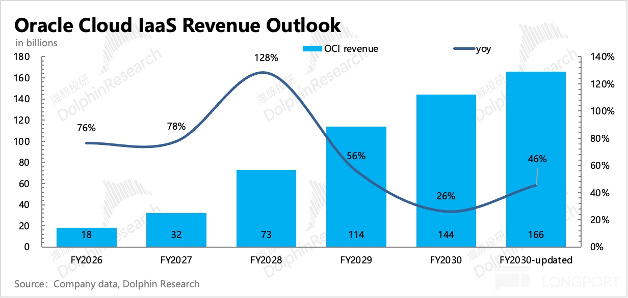 作为与 OpenAI 捆绑最深的一方,甲骨文也是赌上身家了。好的是,未来的收入增长几乎由 OpenAI 决定,OpenAI 也会尽可能把最多的算力需求订单给到它,比如 27 年开始的 5 年 3000 亿订单。这才有了 Q2 业绩会上 “炸裂” 的长期增长指引,以及 AI World 大会上的 “任性” 上调: