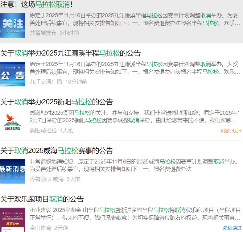 如山西临汾、湖南株洲、北京延庆等地的马拉松赛事相继宣布取消,广西桂林、武汉光谷、安徽池州等地宣布取消健康跑或迷你跑项目,广西南宁等地缩减参赛规模,四川西昌等地调整奖项设置等。