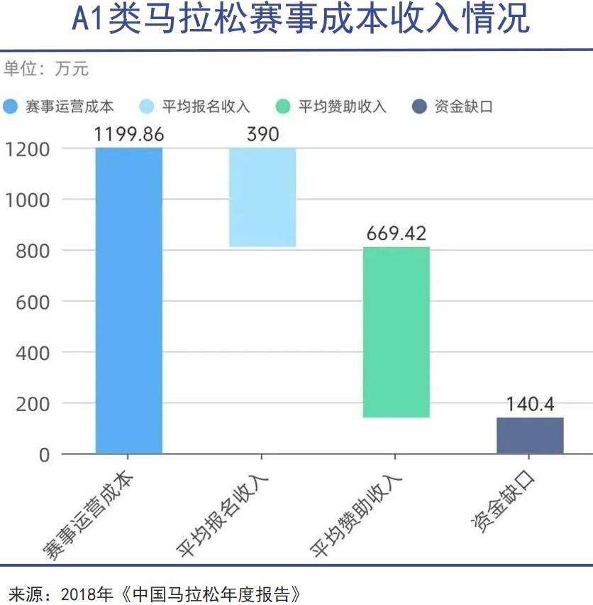 根据《中国马拉松年度报告(2018)》的数据,以A1级赛事为例,办一场赛事的平均运营成本约1199.86万元,即便算上报名费和赞助收入,还有100多万元的资金缺口,而这部分缺口基本要依靠政府补贴来填补。