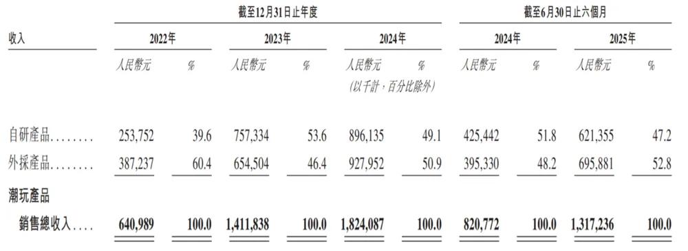 然而,这份亮眼成绩单的背后,却暗藏一组充满矛盾的关键数据:2025年上半年,其45.5%的营收依赖母公司名创优品渠道,52.8%的收入来自外采IP,而毛利率仅为32%,不足泡泡玛特的一半。