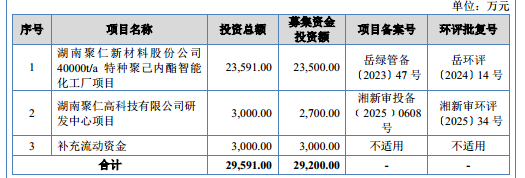 聚仁新材此次北交所IPO欲募集2.92亿元分别用于湖南聚仁新材料股份公司40000t/a特种聚己内酯智能化工厂项目、湖南聚仁高科技有限公司研发中心项目、补充流动资金,具体情况如下: