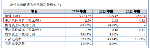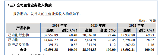 报告期内聚仁新材两大核心产品的平均单位售价均呈现持续下滑趋势,且降幅显著。作为公司第一大业务的己内酯衍生物,2022年-2024年平均单位售价分别为4.45万元/吨、3.98万元/吨、2.95万元/吨,其中2024年的单价较2022年累计下滑33.71%,三年间价格缩水超三成;而作为第二大业务的己内酯,同期平均单位售价同样持续下降,从2022年的4.33万元/吨降至2023年的3.98万元/吨,2024年进一步跌至2.79万元/吨。