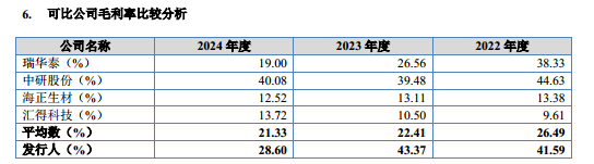 不过,即便2024年毛利率大幅收缩,聚仁新材的毛利率水平仍保持着行业优势。据公司申报稿披露,其选取的同行可比公司分别为瑞华泰、中研股份、海正生材、汇得科技,上述4家公司毛利率的平均值分别为26.49%、43.37%、28.6%,从数据对比来看,聚仁新材各期毛利率均显著高于同行均值,即便在2024年毛利率大幅下滑后,仍比同行均值高出7.27个百分点。