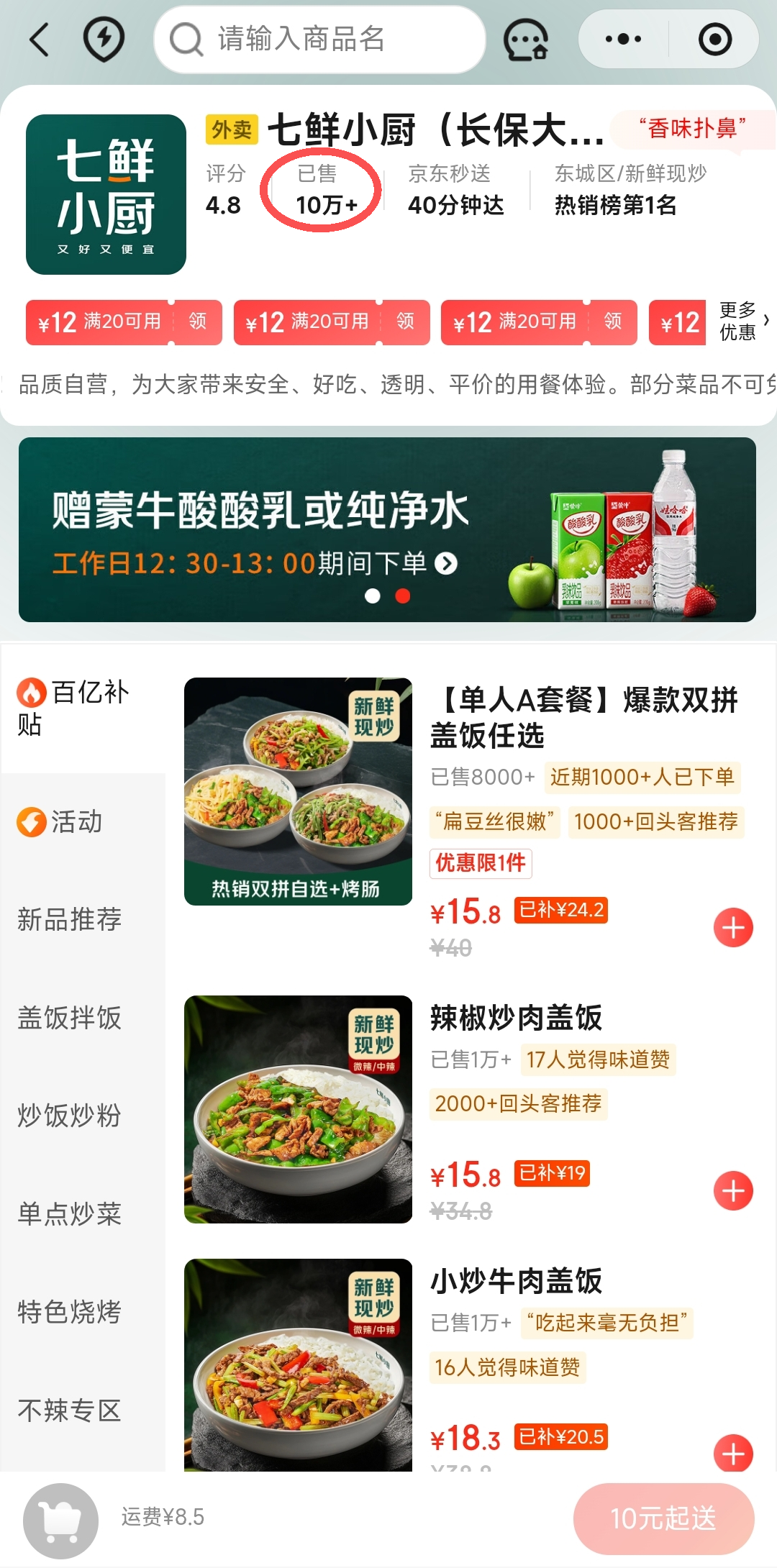 今年7月,京东推出“七鲜小厨”,并宣布未来3年内在全国建设1万家,主打现炒现做。截止10月29日,其首店(长保大厦店)在京东外卖平台显示累积销售10万+单,饿了么和美团的月销量分别为900+单、300+单。
