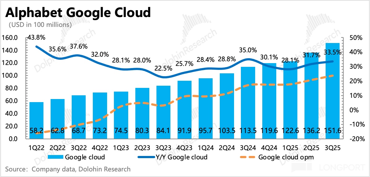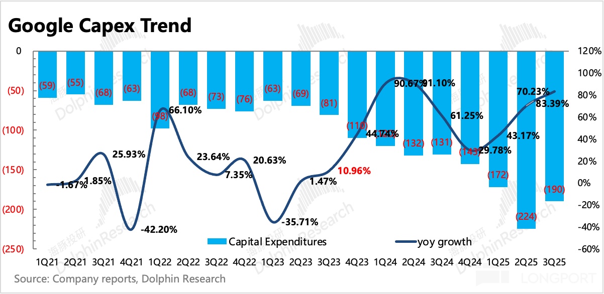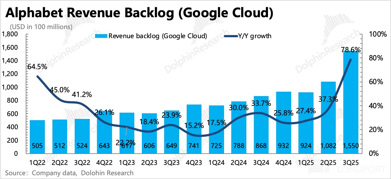 2. 谷歌云景气度持续:云业务现在已经主要看积存的未履约订单了(Revenue Backlog),只要订单积累保持高增速,那么未来一段时间的云收入增长就能够保持。截至 Q3 末,积存订单达到 1550 亿,同比增长 43%,环比净增 470 亿,不包含最近刚爆出的 Anthropic 的 200 亿订单。有了这些订单存货,收入增速可以在一段时间继续保持在 30% 以上。