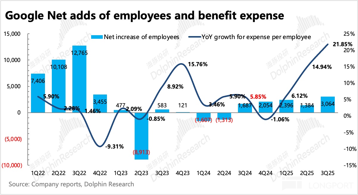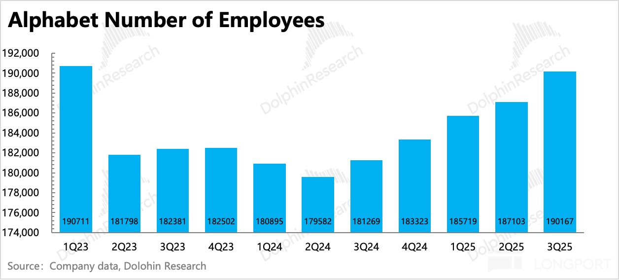 不过盈利能力优化,主要靠的是收入端的扩张。实际支出的绝对值上,还是增长的。其中销售费用负增长,管理费用剔除罚款也是同比持平,主要新增就是来自研发费用。三季度集团员工规模净新增了 3064 人,但后续大厂对传统业务优化裁员还是主要方向。年初谷歌就颁布了自愿离职方案,后续应该还是保持进出稳态区间(优化传统业务,新增 AI 等新业务),而非趋势性的扩张。
