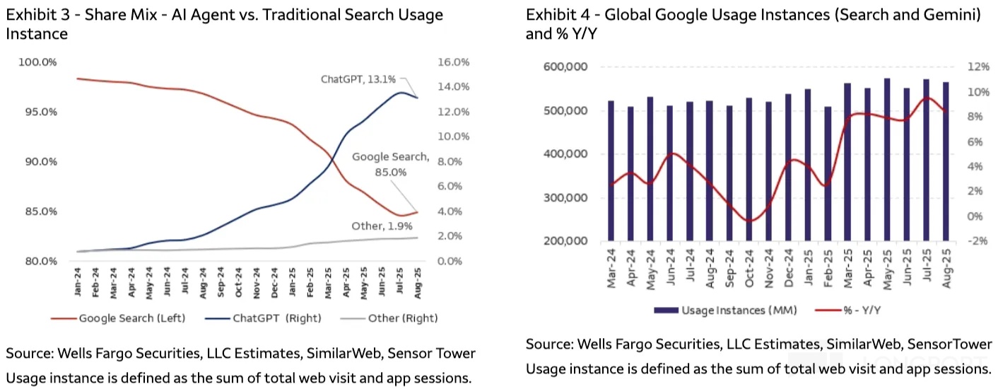 一方面,搜索上 AI Overview 和 AI Mode 拉高了用户活跃,将二季度跌到 90% 以下份额的谷歌重新又拉了回来。同时谷歌还通过新产品 Nano Banana 将 Gemini 生态的活跃度进一步激活。