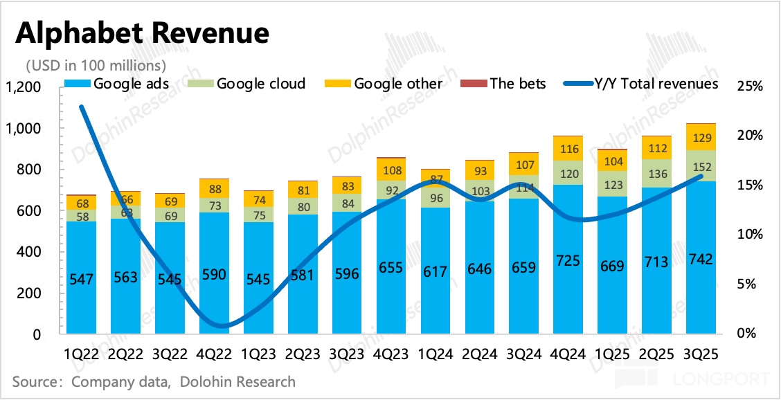 三季度广告收入 742 亿美元,整体增长 9.9%。核心的搜索、YouTube 均达到 15% 的增速,包括因美元贬值在欧洲市场的顺风。三季度暂时走出关税阴霾,继续恢复投放需求。