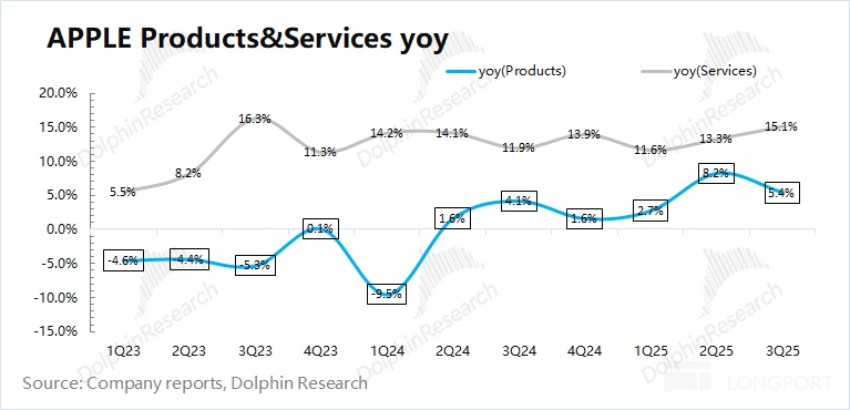 2025 财年第四季度(即 3Q25)软件服务收入 288 亿美元,同比增长 15.1%,市场一致预期(282 亿美元)。即使在美国 App Store 允许外部链接的情况下,苹果软件服务收入增长仍有所提速,体现了苹果软件生态的壁垒。